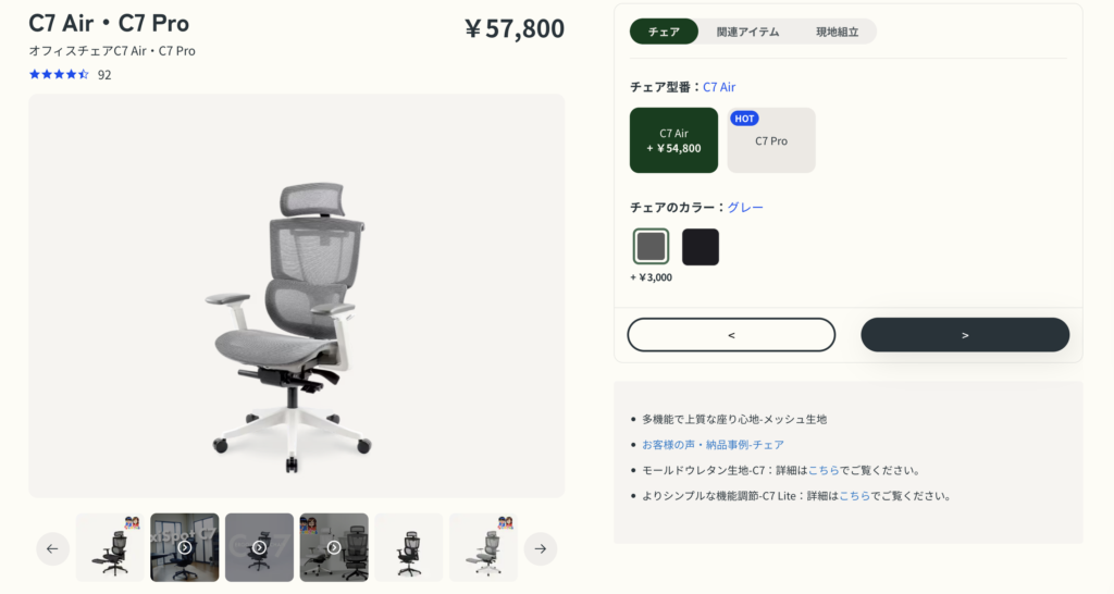 一般的な椅子では20~30kg/m³のウレタンが使用されますが、C7シリーズは高密度の45kg/m³モールドウレタンを採用。